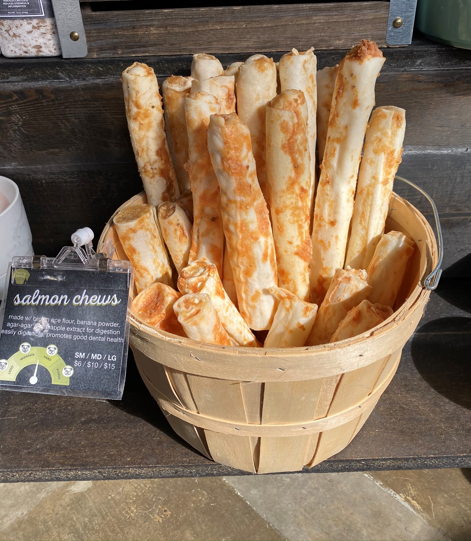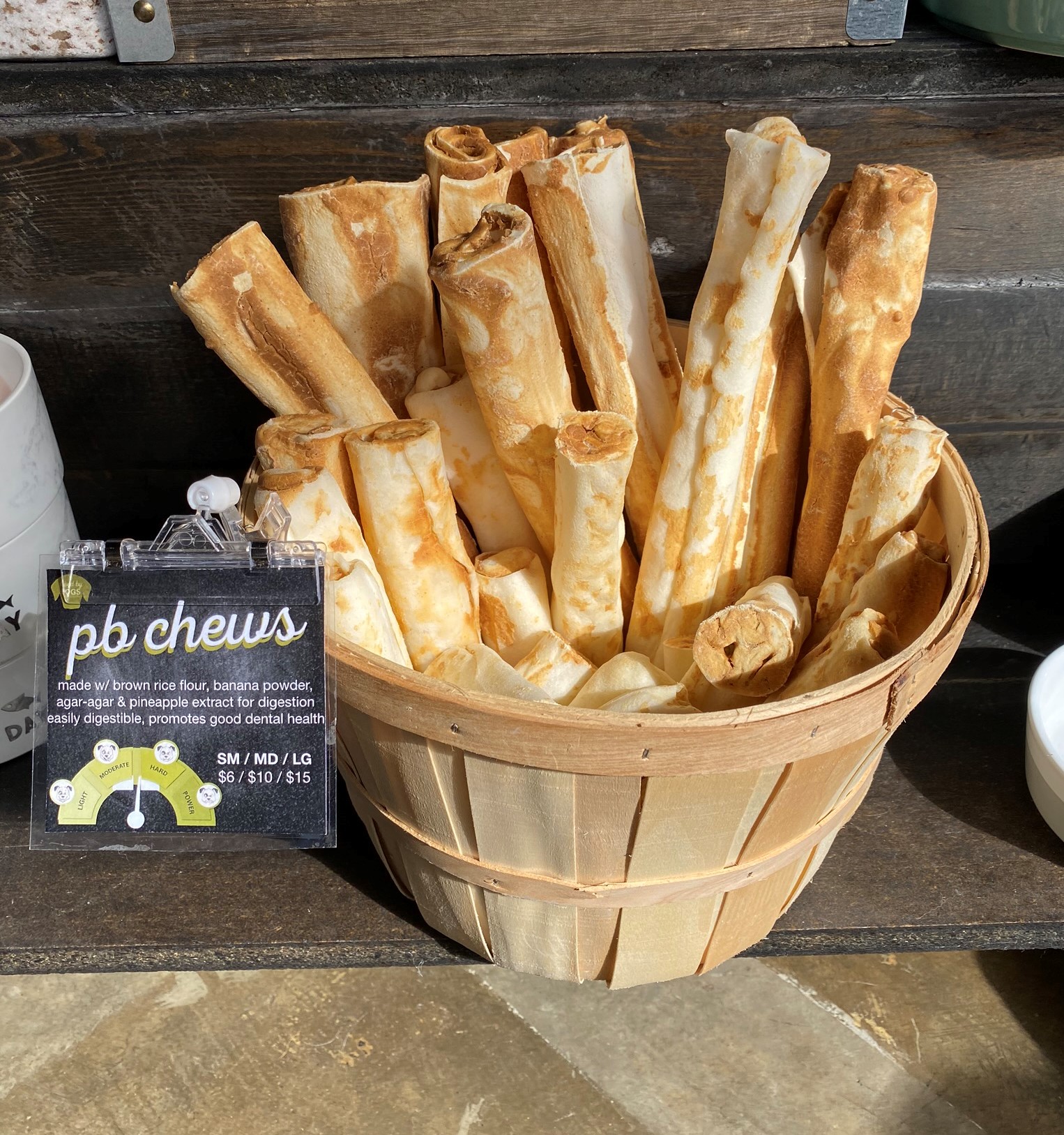 NO rawhide! Made with brown rice flour, banana powder, agar-ager and pineapple extract for digestion. Five different flavor options, and three different sizes for any and all pups!